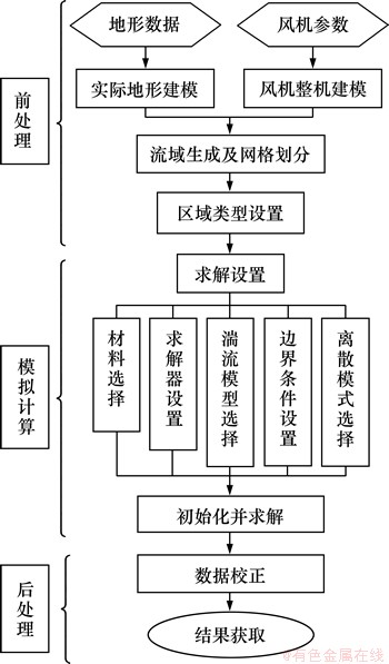 采用Fluent流体计算软件进行风场模拟,其过程包括前处理、模拟计算和后处理3个部分。首先由实际地形图和风机参数通过Gambit或其他前处理器建立几何模型,并用Gambit进行流场网格划分与边界设置,然后,将输出文件导入Fluent求解器进行求解设置和迭代计算,最后对计算结果进行后处理。图1所示为整个模拟过程的流程图。