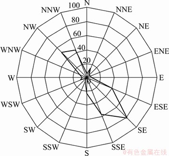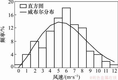 通过对大量实地测得的风速风向进行处理,整理出9号风力机场址附近2009-10-12至2010-10-11的10 min平均风速风向。图2和图3所示分别为10 m高度处的风速、风向频率图,得到距地表10 m高度处的年平均风速为5.97 m/s,主风向为东南方向且比较稳定,说明该场地是风力机的合理场址。