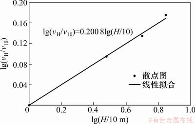 采用指数模型,对不同高度处实测年平均风速加以整理并进行曲线拟合,得到如图4所示的线性函数,其表达式为