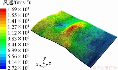 山区地表起伏多变,近地面风场表现出很不均匀性。图6所示为距地表10 m 高度处的风速矢量图。从图6可以看出:(1) 进口距地表10 m高处风速为5.97 m/s,气流从进口到山脚一定高度因受到地表的摩擦作用,能量逐渐耗散,风速减小至进口速度的75%左右;(2) 气流从山脚攀升到山顶过程中速度逐渐增大,这是由于气流受到山坡的挤压而增速,即存在伯努利效应,山顶附近风速较大,最大为16.9 m/s;(3) 经过小山时,气流受到阻挡而向山峰两侧绕流,在与主风向相切的山峰两侧形成加速区;(4) 气流绕过山顶后速度回落到迎风面半山腰风速,为9~11 m/s,不过山背低洼处风速降低更明显。