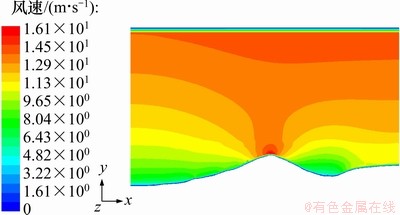 图7和图8所示分别为z=0剖面流场的风速云图和山顶上空风速沿高度分布的散点图。由图7和图8可知:(1) 速度入口边界以指数模型输入风速,迎风面山体高度以下范围内的气流速度等势线接近水平;(2) 由于受到山体绕流的影响,山顶上空60 m范围内气流速度急剧变化,风剪切偏离指数分布规律而表现出严重的“负切变”现象,而在60~200 m高度区域风剪切几乎为0,因此,山顶特别适合安装大型风力机;(3) 气流流经山丘的迎风面进入背风面时,气流受到扰动减速,但由于小山地表坡度较缓,在背风面没有形成明显涡流。