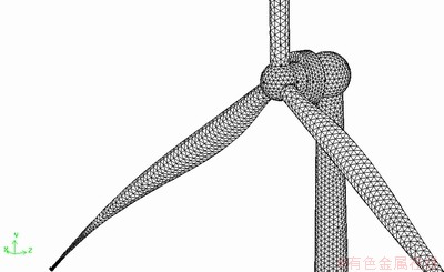 将风力机安装在计算域中心小山的山顶,且使风轮轴线与主风向对中。因风力机表面及地表形状复杂,对风力机各部分表面网格及附近的体网格、旋转域内的体网格及地表附近体网格采用非结构化网格,并进行加密;其他静止域采用相对较粗的结构化网格,粗细网格逐渐过渡,最终体网格总数达160万。图9所示为加密的风机表面非结构化网格。