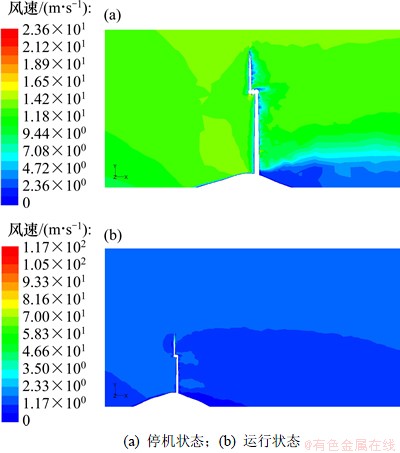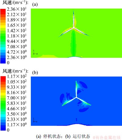 图10所示为风力机在停机状态和运行状态流场横剖面的速度云图。从图10可以看出:(1) 在停机状态下,塔影效应明显,但叶片之间没有相互影响,气流在叶片根部附近速度较大,最大达23.6 m/s;(2) 在运行状态下,风轮旋转引起扫掠面内的气流增速,高速区主要集中在靠近叶尖的1/2叶展附近,叶片尾缘气流产生分离;(3) 叶片周围的速度等值线密集,数值变化较大,说明叶片表面附近的压力梯度较大。