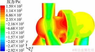 (1) 轮毂及机舱表面压力。机舱尾外轮廓比较圆滑,其外表面受到的压力比较均匀;轮毂及发电机壳的前表面气流滞止处形成了相对高压区,而在侧表面形成了负压区,因此,在设计风力机各部件外形时应考虑平滑过渡以降低表面压力。图12所示为风力机轮毂与机舱表面的压力云图。