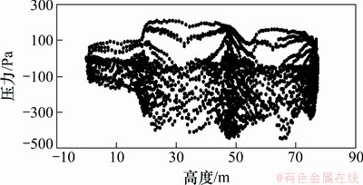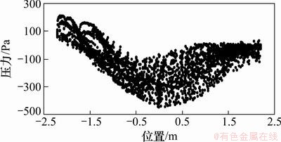 (2) 塔筒气动载荷。图13和图14所示分别为塔筒表面各点的压力随高度分布和顺风向分布的散点图。由图13和图14可知:1) 距塔底18 m高度范围内塔筒壁的压力明显低于此高度以上塔筒壁的压力,前者仅为后者的一半左右;2) 塔筒壁除了迎风面小范围内受到正压力外,绝大多数部位均承受负压力,且各截面最大负压力绝对值为最大正压力的1.2~2.0倍,塔筒壁最大正压力为214 Pa,最大负压力为-448 Pa;3) 计算得到塔筒水平风荷载合力为25.92 kN,约占整个风电机组顺风向水平风荷载的15.6%。