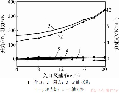(3) 风轮气动载荷。改变入口边界风速并考虑风剪切重复计算,得到不同来流风速条件下风轮的气动荷载情况,如图15所示。从图15可见:阻力和绕x轴的力矩(扫掠面内的扭转力矩)是风轮的主要气动荷载;当入口风速为5.97 m/s时,风轮阻力为140.65 kN,扫掠面扭转力矩为5 870.3 kN·m;随着风速的增大,风轮阻力和扫掠面扭转力矩亦逐渐增大,且风速越大其增加的幅度也越显著;而风轮升力和绕y轴和z轴的力矩均较小,随风速增大变化甚小,风轮整体升力为负值,说明风轮受到的升力向下。