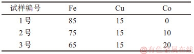 实验采用常规共沉淀法制备预合金粉。按表1中各元素质量配比称取相应的氯化物原材料,分别溶于去离子水中,形成FeCl2·4H2O,CoCl2·6H2O和CuCl2·2H2O等水化合物,混合配制成浓度为1.0 mol/L的水溶液,另外配制浓度为1.0 mol/L的草酸溶液。将金属盐溶液和草酸溶液通过加液釜以相同速率分别加入反应釜中进行共沉淀反应,反应温度为50 ℃,充分搅拌后加入氨水溶液调整反应溶液的pH,使其保持在2左右。反应20 min后再静置沉淀2 h,获得FeCuCo及FeCu复合草酸盐沉淀物,沉淀物经过过滤、清洗、煅烧和还原,得到所需要的预合金粉。