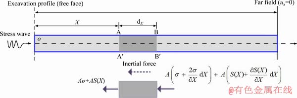 A simplified mechanical model was built considering the problem as one-dimensional wave propagation in a long and slim rock rod with initial gradient stress applied to the radial orientation (see Figure 2). It should be noted that the rock rod is an incompressible material under excavating-induced stresses on most occasions of excavation projects. The left end was set as a free boundary representing the excavation profile, and the right hand end was fixed representing far field rock mass. For this scenario, a dynamic stress wave was applied on the left boundary of the rod.