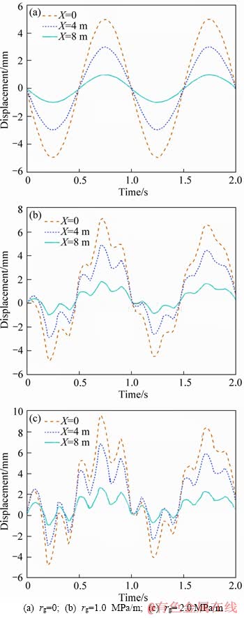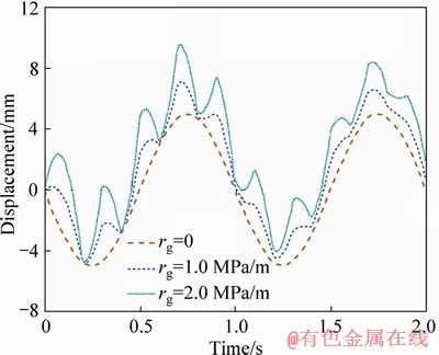 can be derived. Figure 3 presents the displacement-time curves of the observation location (X=0) under varying GSRs. It is indicated in Figure 3 that when rock is free from gradient stress (i.e. rg=0), the curve form of displacement against time is the same as the original waveform. However, the waveform changes with the GSR when the stress gradient is not equal to zero. It can be observed that the waveform for rg=2.0 MPa/m is more complicated than that of rg=1.0 MPa/m, and is far more different from the original waveform.