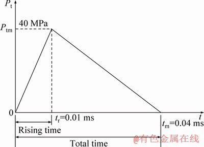 It is observed that the gradient stress rate is independent to the opening’s radius, but is related to the vertical pressure and lateral pressure coefficient. Hence, according to Eq.(10), if the vertical pressure applied on the opening reaches 20 MPa, the gradient stress rate can be obtained as 5.9 MPa/m for lateral pressure coefficient K=1,10.8 MPa for K=2, and 15.8 MPa for K=3. In the model, three gradient stress rates of 5.9, 10.8 and 15.8 MPa/m were set up to study how they influence the dynamic responses of rock with initial gradient stress, respectively. Figure 5 shows the stress gradient distribution in the numerical model. Meanwhile, in the explicit calculation stage, a triangle stress wave with one peak was added on the model. The total action time of the stress wave was 4.0×10-5 s, of which the rising time was 1.0×10-5 s and the peak stress (Ptm) was 40 MPa, as seen in Figure 6.
