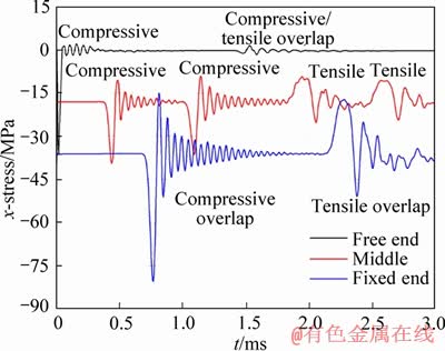 Figure 9 Stress history curves of elements at free end, middle and fixed end