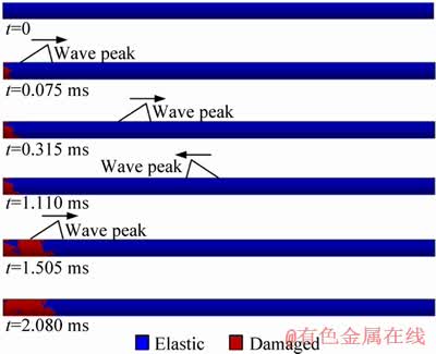 Figure 10 demonstrates the damage evolution process of the rock in the gradient stress field. It is seen that the damage is mainly generated at or near the free face. Part of the damage zone is induced by the straight action of compressive stress wave, while other damage is caused by the tensile wave generated in the rock rod.