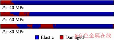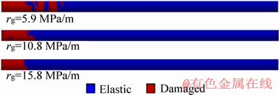 By applying accelerations of 2185.2 and 5851.6 m/s2 to the x-direction on the model, the gradient stress rates of 5.9 and 15.8 MPa/m can be achieved, respectively. In this section, additional simulations were conducted with varying GSRs and identical dynamic stress wave to investigate how the initial gradient stress rate influences the damage characteristics. Figure 11 presents the simulation results of damage zone of the rock under different GSRs. It is indicated that the damage zone is narrowed as the magnitude of the GSR increases. Furthermore, the damage zone is non-continuous amongst with two small elastic regions for the occasion when the GSR is as low as 5.9 MPa/m. This phenomenon is illustrated in the following.