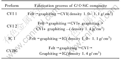 以密度为0.5~0.6g/cm3的PAN基炭纤维针刺整体毡为预制体, 用化学气相渗透(CVI)、浸渍炭化(IC)的方法制备不同密度、不同基体炭及不同孔隙的C/C多孔坯体。 CVI在均热式化学气相渗透炉进行, 以丙稀为碳气源, 温度800~1000℃, 沉积时间80~100h。 IC采用低压浸渍, 浸渍介质为呋喃树脂、 浸渍压力为2MPa、 固化温度约为180~200℃, 炭化温度为800~1000℃; 石墨化温度为2100℃。 其坯体的制备工艺列于表1。