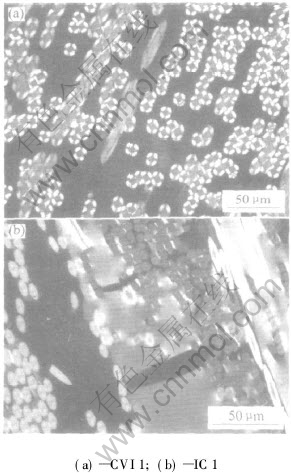 图1所示分别为不同工艺制得的坯体在偏振光下的金相组织。 从图中可看出, CVI1坯体中的热解C环绕着一根根的炭纤维(Cf), 其余区域为较集中的孔隙; 而IC1坯体中树脂C的分布较分散, 在Cf密集区外有块状的树脂C。 因而同样密度、 经IC工艺制备的坯体孔隙分布较分散, 开口孔隙度较小, 这从表2中不同坯体孔隙度的数据得到证实。