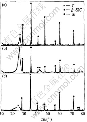 Fig.2 XRD patterns of C/C-SiC composite fabricated by infiltrating Si into different performs