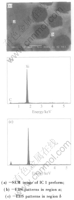 图3, 4, 5和6所示分别为不同坯体渗硅后C/C-SiC复合材料的金相组织。 从图中可看出渗硅后的组织为深色的Cf相、较暗色相和远离Cf密集区的浅色相组成。 根据图7扫描电镜的能谱成分分析可知, 在远离Cf密集区的a点有Si存在, C的谱线强度几乎为零, 此处主要为单质Si相; 而Cf附近的b点有Si和C存在, 且质量分数分别为72%和28%, 此处主要形成了SiC相。