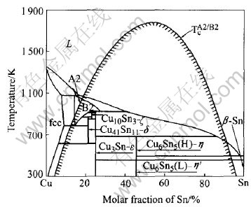 Fig.1 Calculated phase diagram of Cu-Sn binary system including A2/B2 order-disorder transition[5]