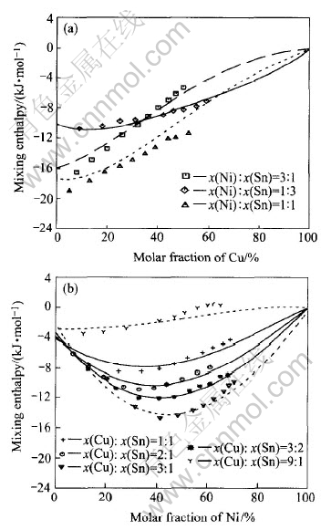 图2 Cu-Ni-Sn合金液相在1580K时混合焓的计算结果[16, 17]