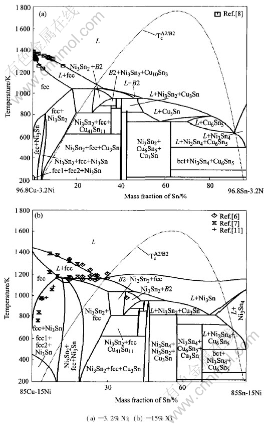Fig.3 Phase diagrams of vertical section for Cu-Ni-Sn ternary system including A2/B2 order-disorder transition