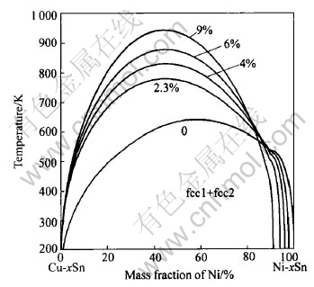 图4 Cu-Ni-Sn系中不同Sn含量fcc相溶解度间隙的计算结果
