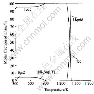 代表性实用合金Cu-9Ni-2.3Sn(质量分数,%)的相分数与温度的关系的计算结果如图5所示。 由图5可看出, 随着温度的降低, Ni3Sn化合物相开始析出, 在更低的温度条件下, 将出现fcc相的溶
