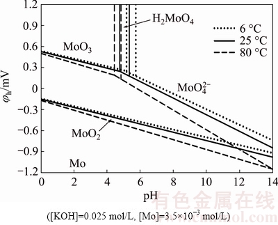 Electrochemical phase diagrams (φ-pH diagrams) are frequently used to predict the stability of minerals in aqueous solutions. A φh-pH diagram was constructed for a Mo-H2O system at 6, 25, and 80 °C in a solution of 0.025 mol/L KOH and 0.0035 mol/L molybdenum species (Fig. 1). The thermodynamic data used to construct the equilibrium diagram were primarily obtained from the HSC chemistry database [8].