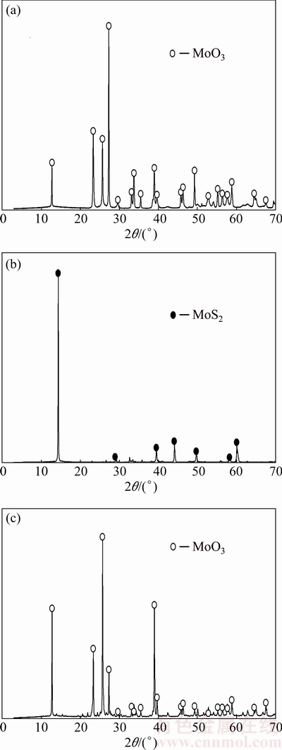 Fig. 2 XRD patterns of original synthetic molybdenite (a), molybdenite concentrate (b) and toasted molybdenite (c)