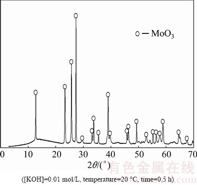 The dissolution of molybdite is given by Reaction 1. To validate the dissolution reaction of MoO3, an experiment using a 0.01 mol/L KOH solution was performed at 20 °C for 30 min. The resulting Mo extraction curve as a function of time is similar to that shown in Fig. 5. The leached solid sample of molybdite was analyzed by X-ray diffraction (Fig. 6).