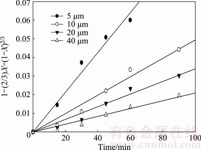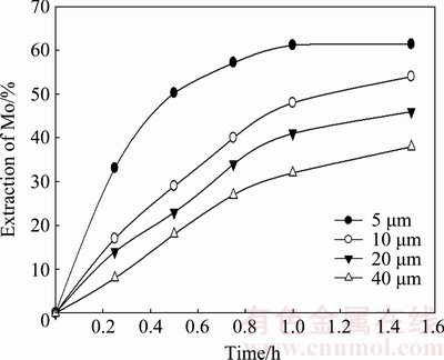 Fig. 14 Dissolution kinetics of molybdite samples with different particle sizes under same leaching conditions as Fig. 7