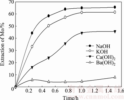 At 0.5 h, Ba(OH)2 elicited the lowest molybdenum extraction rate of only 4.2%. Meanwhile, Ca(OH)2 had a higher rate of extraction than Ba(OH)2, reaching 24%, although it was less than that for KOH and NaOH. The comparatively better performances of KOH and NaOH are clear, having extraction rates of 50.2% and 58.3%, respectively, after 0.5 h.