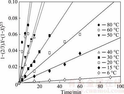 Figure 11 shows the graph of 1-(2/3)X-(1-X)2/3 as a function of time using the experimental data highlighted in Fig. 4, at temperatures ranging from 6-80 °C for the dissolution of 5 μm samples of molybdite. As seen, the good linear fit of the kinetics data with the regression model (R2) from 0.94 to 0.99 over the given temperature range indicates the suitability of Eq. (5). The kinetics constants at various temperatures were obtained from the slopes of the straight lines and are shown in Table 1.