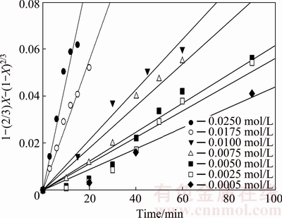 Fig. 11 Dissolution kinetics of molybdite for average particle size of 5 μm in KOH-H2O system under same conditions as Fig. 4
