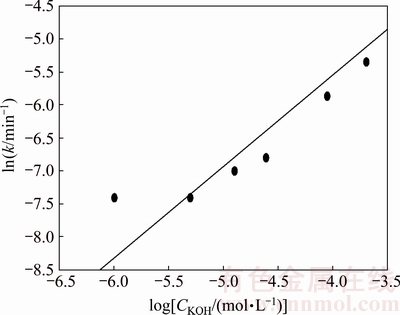 The order of reaction, m, was calculated from the kinetic data on the effect of the KOH solution concentration. Figure 12 shows the experimental data for several KOH concentrations according to Eq. (4); the k values were used to graph ln k versus ln CKOH, as shown in Fig. 13. As seen, a linear relationship is obtained with R2 value equal to 0.87. The slope indicates an order of reaction of 1.0 with respect to the KOH solution concentration.