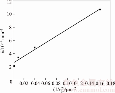 Fig. 15 Dependence of velocity constant on squared inverse of initial particle size on leaching of molybdite