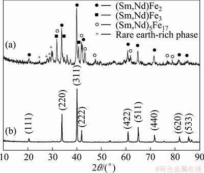 Fig. 1 X-ray diffraction patterns of as-cast (a) and annealed (b) (Sm0.5Nd0.5)Fe2 alloy