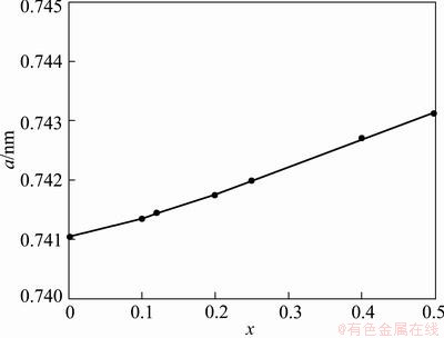 After being annealed, the (Sm1-xNdx)Fe2 alloys are the single (Sm,Nd)Fe2 phase when x≤0.5. As we know, the NdFe2 compound does not exist in the equilibrium phase diagram and our result shows that only after the sample was annealed at 800 °C for 10 d, the microstructure of (Sm0.5Nd0.5)Fe2 alloys becomes a single (Sm,Nd)Fe2 phase, as shown in Fig. 1(b). PINKERTON et al [10] reported that they were unsuccessful in forming the MgCu2-type structure in Sm0.5Nd0.5Fe2 ingots by annealing at 700 °C for 72 h. BABU et al [3] investigated the structure of Sm1-xNdxFe1.93 alloys and found that the single (Sm,Nd)Fe2 phase with the cubic Laves phase structure is at x=0.32 and a small quantity of the (Sm,Nd)Fe3 phase is observed for the x=0.36. The structural, magnetic, and magnetostrictive properties of Tb1-xNdx(Fe0.9B0.1)2 alloys were investigated in Ref. [11] and it was found that the alloys, homogenized at 700 °C for 7 d, consist predominantly of the cubic Laves phase with a MgCu2-type structure and a small amount of rare earth-rich phase when x≤0.55. Our result indicates that we have successfully obtained the single (Sm,Nd)Fe2 phase with 50% Nd by suitably annealing. When x>0.7, the main phase becomes (Sm,Nd)5Fe17 and rare earth-rich phase is a small amount of phase. The (Sm,Nd)5Fe17, (Sm,Nd)Fe2, and rare earth-rich phase coexist in the range of 0.52 phase for (Sm1-xNdx)Fe2 alloys is shown in Fig. 2 and it linearly increases with increasing Nd content up to x=0.5. The increase in the lattice parameter is attributed to the large size of Nd atoms (the radius of Nd atom is 0.182 nm, and that of Sm atom is 0.181 nm).
