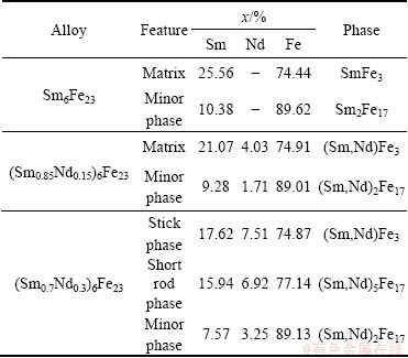 Table 3 EPMA data of Sm6Fe23, (Sm0.85Nd0.15)6Fe23, and (Sm0.7Nd0.3)6Fe23 alloys