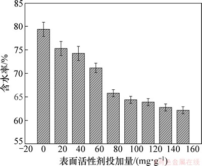 如图1所示,随着表面活性剂(1227)投加量的增多,调理后污泥的脱水性能明显提高。污泥滤饼含水率由表面活性剂投加量为0 mg·g-1时的79.36%降至表面活性剂投加量为150 mg·g-1时的62.15%,降幅达17.21%。其中,表面活性剂投加量由56.25 mg·g-1升至75 mg·g-1时,污泥滤饼含水率有较大幅度降低,由71.45%降至65.78%,下降了5.67%。表面活性剂投加量大于75.00 mg·g-1后,污泥滤饼含水率降低的趋势变缓。