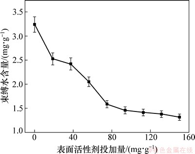 污泥滤饼含水率的降低是由于污泥中束缚水含量的减少。束缚水凭借分子间力结合在污泥絮体中[26],被认为是机械脱水的上限,不能通过机械方法脱去。束缚水含量对污泥脱水性能有关键性影响,Colin和Gazbar[27]认为:束缚水含量可直接用于衡量机械脱水的难易程度,束缚水越多,机械脱水越难,反之则越容易。表面活性剂调理后,污泥滤饼中组成见表2,束缚水含量如图2所示。可见:投加表面活性剂可明显降低污泥中束缚水含量,表面活性剂投加量由0 mg·g-1增至75 mg·g-1时,束缚水质量分数由3.24 g·g-1快速降至1.58 g·g-1,降幅达51.23%,继续增加表面活性剂投加量,束缚水含量减小的幅度变缓。束缚水含量的变化趋势与污泥滤饼含水率的减小趋势(图1)相吻合,说明污泥滤饼含水率的降低是表面活性剂作用下污泥中束缚水释放出来的结果。最终,当表面活性剂投加量为150 mg·g-1时,束缚水含量减少至1.31 g·g-1,降幅为59.57%。另外,污泥中仍有约40%的束缚水未能释放出来,一个较为合理的原因是这部分束缚水与污泥絮体以更强的化学键相结合,不易与表面活性剂作用而被释放溶入污泥液相中。