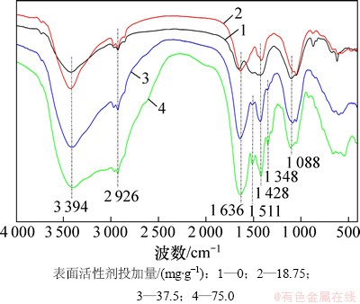 不同量表面活性剂调理下所提取所得的污泥S-EPS的红外光谱如图4所示。未调理污泥中的S-EPS分别在3 394,2 926,1 636,1 428,1 088 cm-1处出现较为明显的吸收峰,在3 394 cm-1附近范围内出现的强宽峰可能是由于O—H伸缩振动引起的,表明S-EPS中有多糖的存在;在2 926 cm-1处的吸收峰,是亚甲基上CH2的对称伸缩振动,可能有脂类存在;在1 636 cm-1处,可以看到一个强肩峰,这代表样品中存在C=O的伸缩振动,表明存在酰胺Ⅰ(蛋白质肽键);1 428 cm-1处出现一个小肩峰,是C=O的伸缩振动引起的,说明有羧基存在;1 088 cm-1处产生的强肩峰表明了S-EPS中多聚糖类物质的存在,因为该范围内的吸收峰是C—O—C伸缩震动的表现。