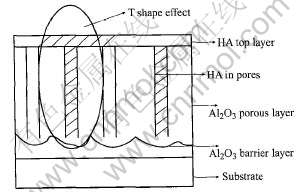 1) 采用PVD、 阳极氧化以及电沉积相结合的技术在Si基底上成功制备了HA/Al2O3复合生物涂层。 其中, HA为外层, HA/Al2O3为中间过渡层, HA HA不仅沉积于阳极氧化Al2O3的孔洞中, 而且外延生长并覆盖在阳极氧化Al2O3表面, 从而在HA外层与HA/Al2O3中间过渡层之间形成了T形分布的结构特征, 即在HA外层与HA/Al2O3中间过渡层间形成了T形界面结构。