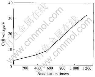 Fig.2 Chang curve of cell voltage with anodization time of Al-Si anodized at constant current of 5mA/cm2
