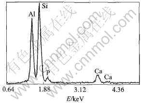 图6所示为HA/Al2O3-Si复合材料层的EDS谱。 由图6分析可知, 涂层中的n(Ca)/n(P)约为1.61, 低于天然骨的n(Ca)/n(P)(1.67), 表明所沉积的复合生物涂层外层为缺钙羟基磷灰石(Ca-deficient HA)。 这是由于电沉积过程中电解质中含有H3PO4, H3PO4经离解或直接与OH-离子(来自pH值调节剂NaOH)反应能生成HPO2-4, HPO2-4进入电沉积物生成缺钙磷灰石(分子式为Ca5-x(HPO4)x(PO4)3-x(OH)1-x, 0≤x〈1)涂层[13, 14], 从而导致所制备复合材料的生物活性外层的n(Ca)/n(P)〈1.67。