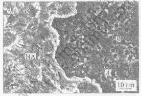 HA/Al2O3复合涂层部分剥离后的表面形貌如图7所示。 图7中左边部分为未被剥离的HA外层, 右边为剥离区域的形貌。 在右边部分的A点处, HA在剥离过程中已从阳极氧化Al2O3的孔洞中拔出而外露出阳极氧化Al2O3的孔洞; B点处HA在剥离后未被拔出, 仍然保留在Al2O3的孔洞并覆盖阳极氧化Al2O3的表面。 这表明HA不仅覆盖阳极氧化Al2O3的表面, 而且还沉积在阳极氧化Al2O3的孔洞中, HA外层形成与本文作者前期工作相似的T形分布结构特征[9-11], 即在HA外层与HA/Al2O3中间过渡层之间形成了T形互锁界面结构(见图1)[11], 这种T形嵌合结构有助于提高生物活性HA外层与中间过渡层间的结合强度。