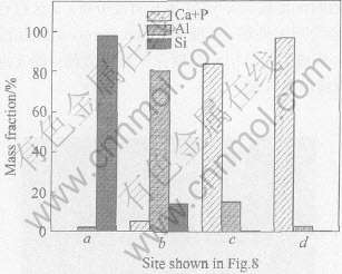 图8所示为Si基HA/Al2O3复合生物涂层的自然断面形貌。 从SEM照片衬度分析, d区白色部分应为HA外层, 其厚度约为3.5μm, a区为Si基底, 阳极氧化Al2O3层则介于两者之间, 即b点与c点间所夹区域。