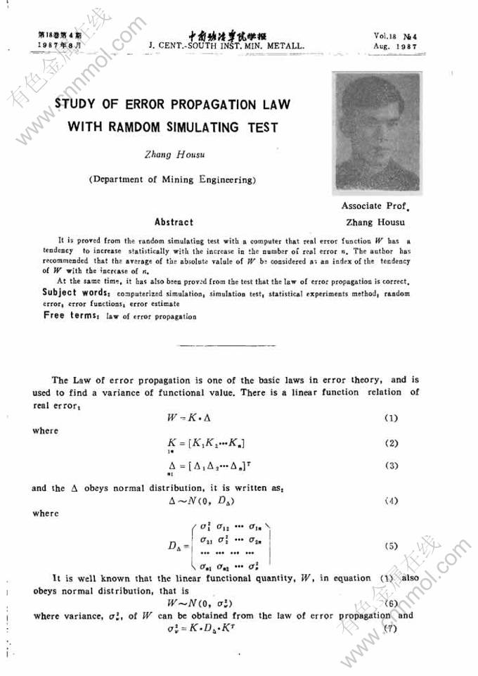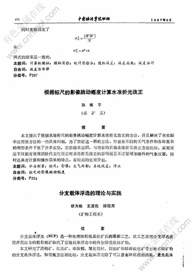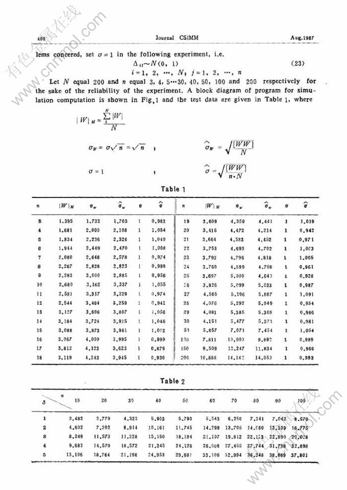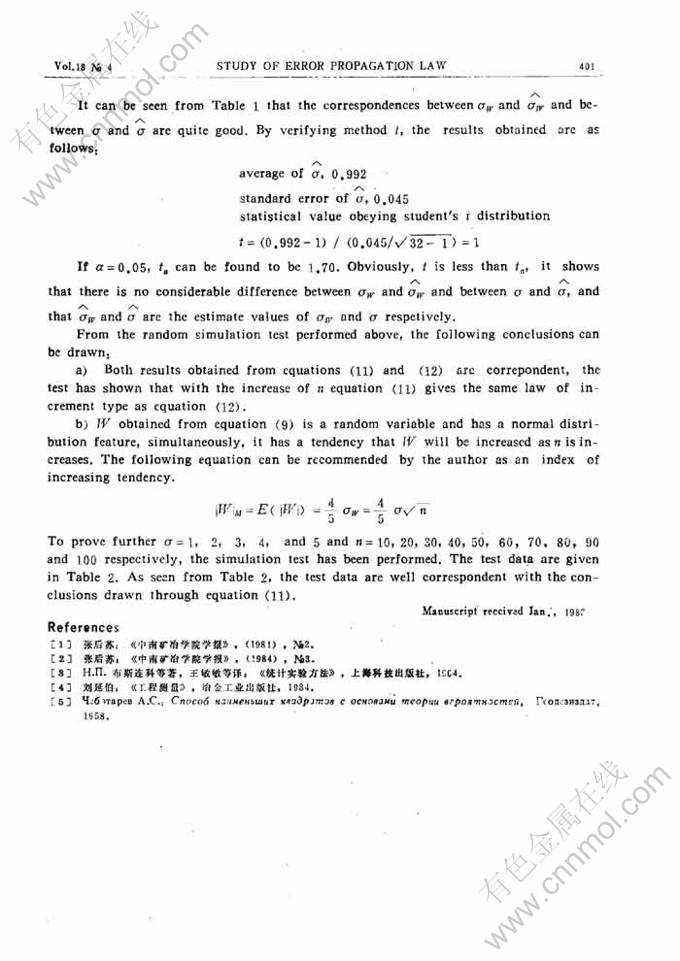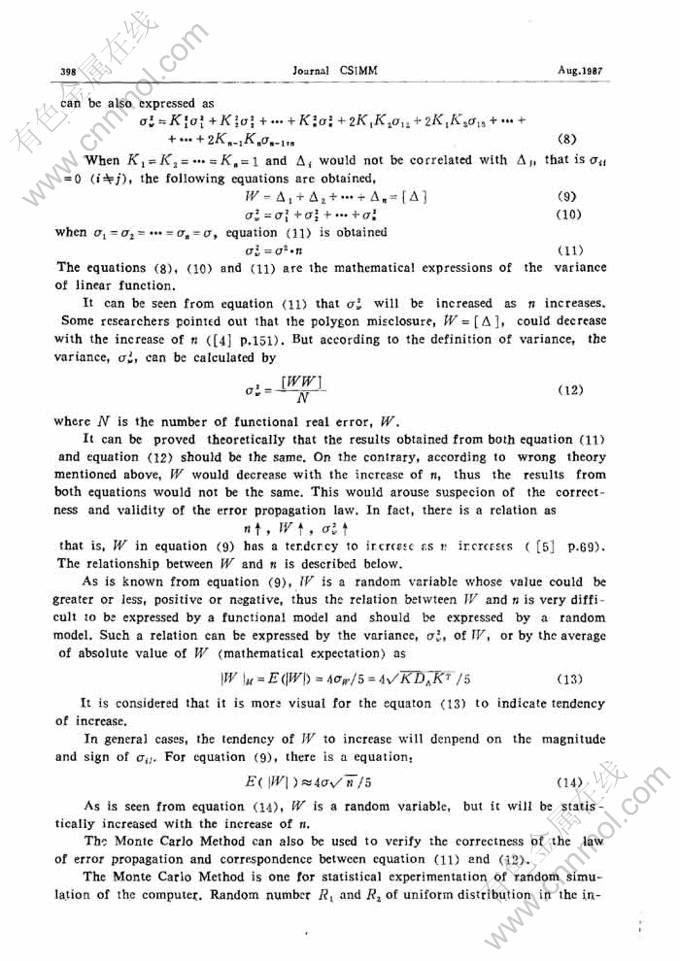 摘 要:电子计算机模拟实验研究证明真误差函数式 W=Δ1+Δ2+…+Δn =[Δ]式中W量虽是随机量,但有随n的增加而统计增加的趋势。作者建议以W的绝对值的平均值。 |W|M=E(|W|)=4/5δn1/2作为W随n增加趋势的指标。同时实验证实了σW2=[WW]/N和σW2=σ2·n两式的结果是一致的。
