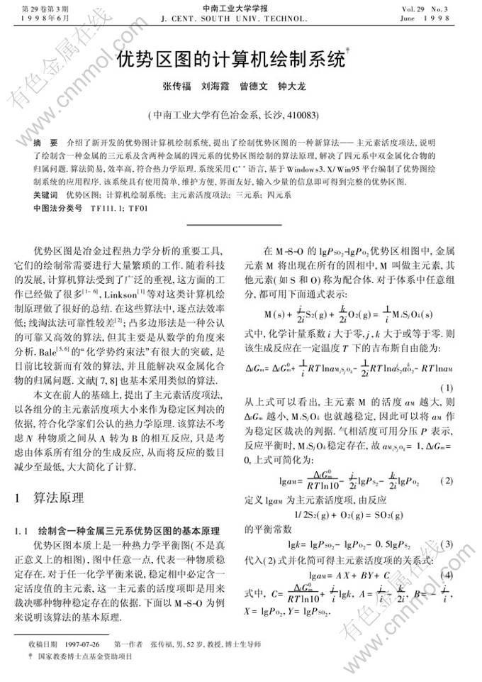 摘 要:介绍了新开发的优势图计算机绘制系统,提出了绘制优势区图的一种新算法——主元素活度项法,说明了绘制含一种金属的三元系及含两种金属的四元系的优势区图绘制的算法原理,解决了四元系中双金属化合物的归属问题.算法简易,效率高,符合热力学原理.系统采用C++语言,基于Windows3.X/Win95平台编制了优势图绘制系统的应用程序.该系统具有使用简单,维护方便,界面友好,输入少量的信息即可得到完整的优势区图.