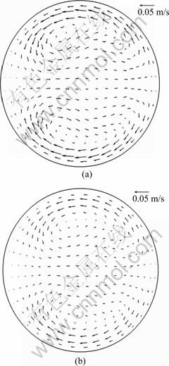 Fig. 3 Velocity vectors of secondary flow for Re=1 000: (a) θ=3π; (b) θ=9π