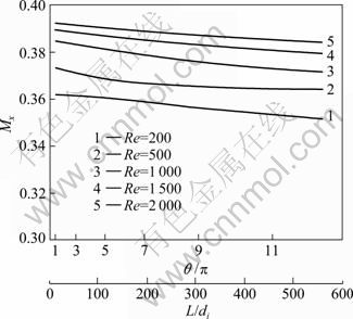 Since momentum shifting is resulted from the secondary flow, the momentum shifting parameter, Mx depends on Re and the radius of curvature directly. Figure 5 presents variation of Mx along downstream (increasing radius of curvature) for different Re. As it goes to downstream from inlet (θ=0) to outlet (θ=12π) of the spiral coiled tube, the radius of curvature is increased to have smaller centrifugal force yielding reduction of Mx. This trend is consistent even for different values of Re. On the other hand, increasing Re increases the centrifugal force to have higher value of Mx at the fixed downstream location. The effect of Re appears more apparent than curvature effect since the centrifugal force is proportional to square of the flow velocity while it is inversely proportional to the radius of curvature.